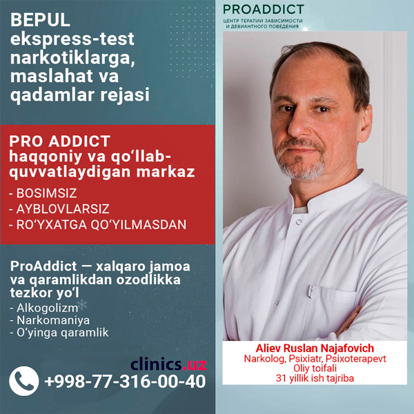 BEPUL ekspress-test narkotiklarga (12 turdagi), mutaxassis bilan maslahat va keyingi qadamlar bo‘yicha reja PRO ADDICT markazida.